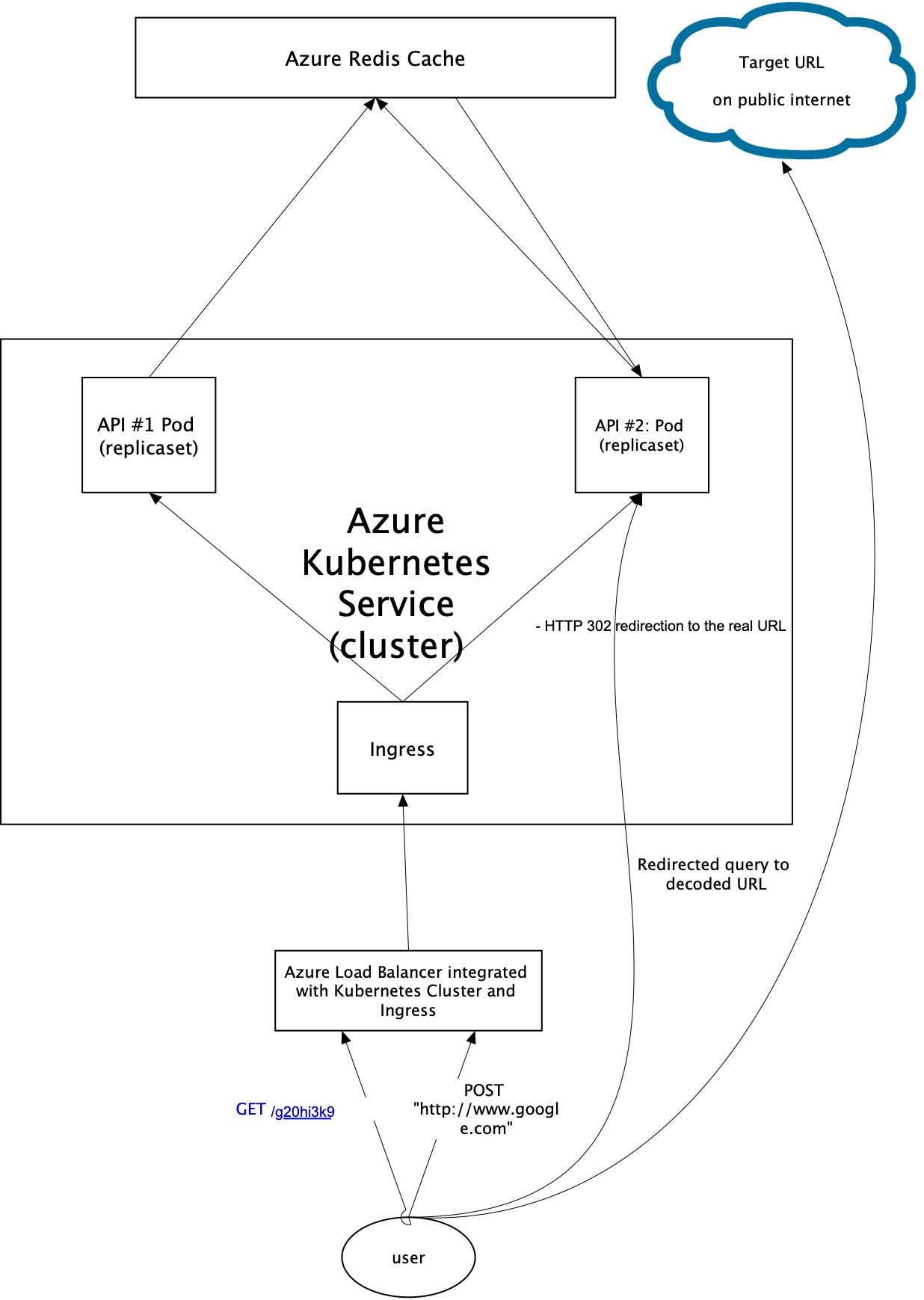 • A Separate API service accepts an HTTP/S GET request for the shortened URL, look-up the shortened URL in the Redis table and returns the decoded URL in an HTTP/S 302 REDIRECT response to the client browser. This allows the user client to access the decoded URL via http/s